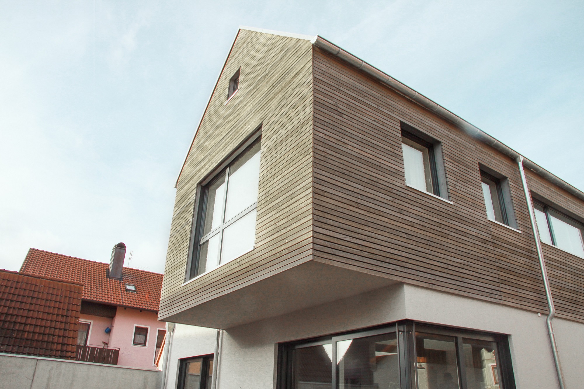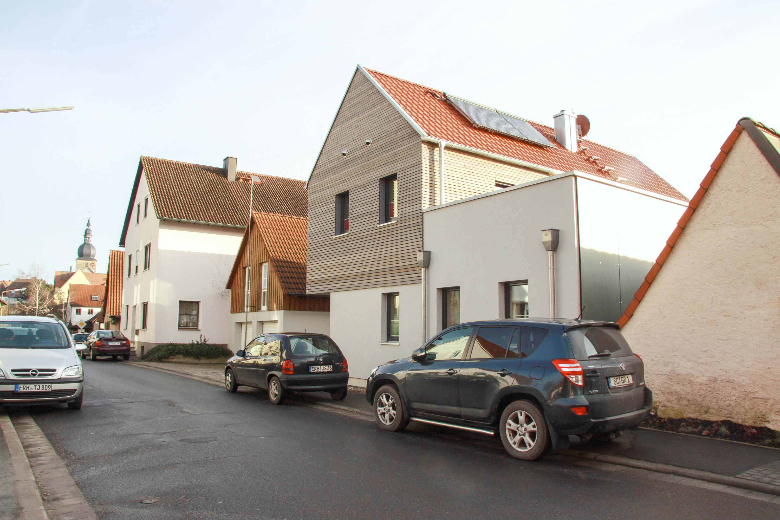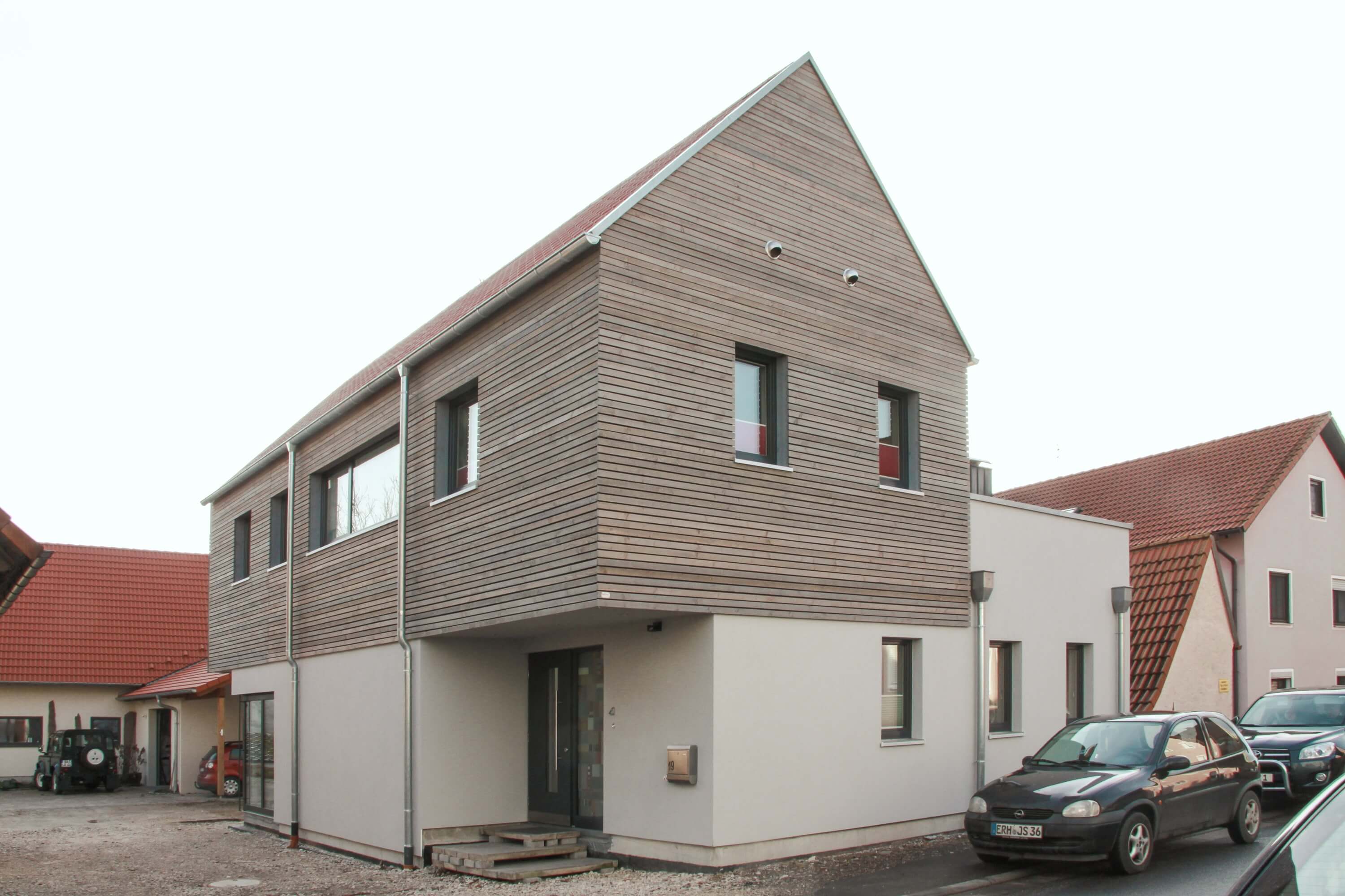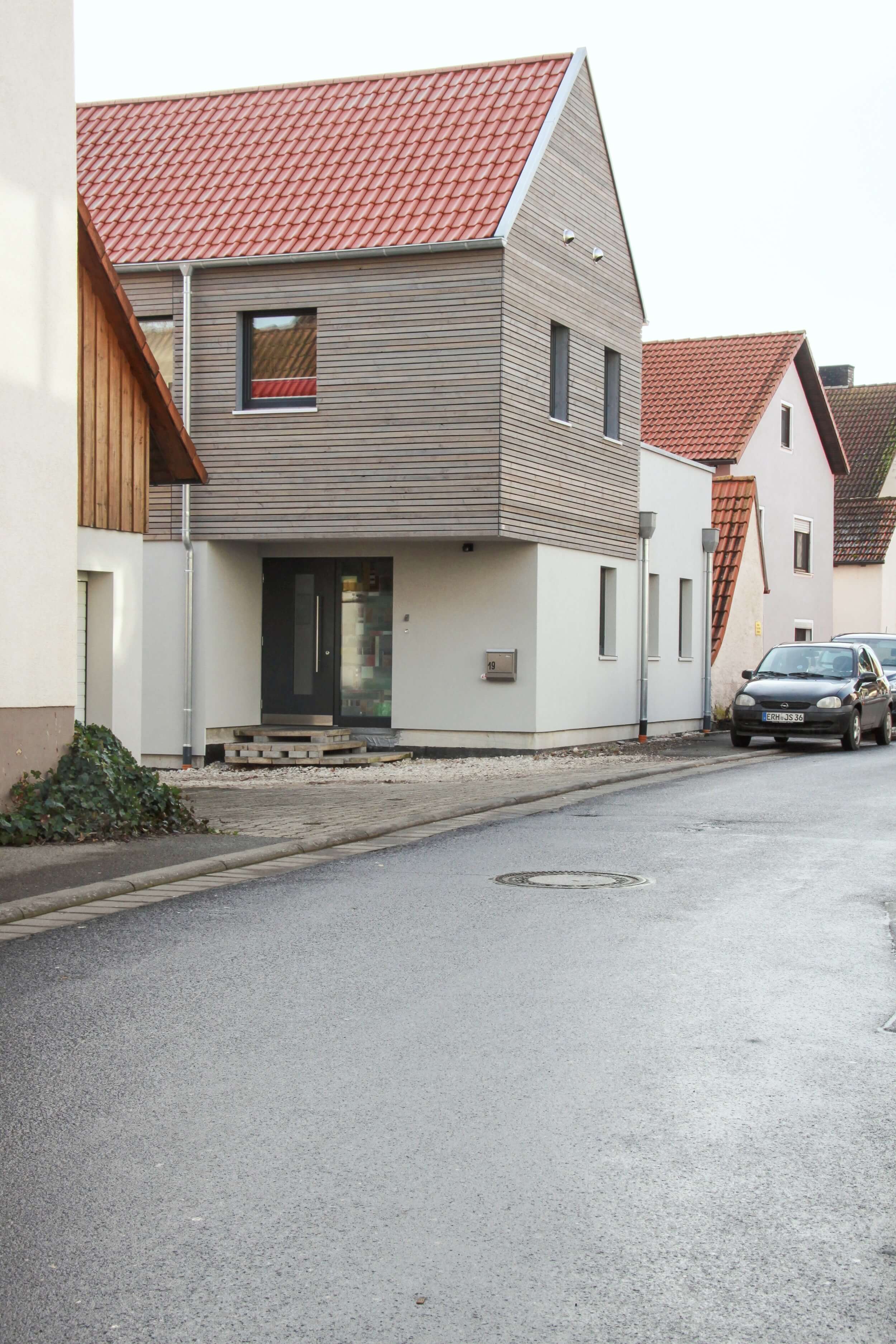 Das Haus L. ist ein Ersatzbau für das einstige Wohnhaus der Hofstelle, die im Herzen Lonnerstadts liegt. Angelehnt an das historische "Lonnerstadter Fachwerk" wurde das Gebäude in Holzbauweise errichtet. Der Entwurf, den unser Architekturbüro in Bamberg erstellte, orientiert sich am vorgefundenen städtebaulichen Kontext sowie an den Wünschen der Bauherren. Im Inneren wurde das Erdgeschoß als fließendes Raumkontinuum mit versetzten Ebenen und vielfältigen Lichteinfällen angelegt. Das Obergeschoß mit Bad und Schlafzimmer gestaltet sich bewusst zurückhaltend und zeichnet sich durch seine hellen, transparenten Räume aus.