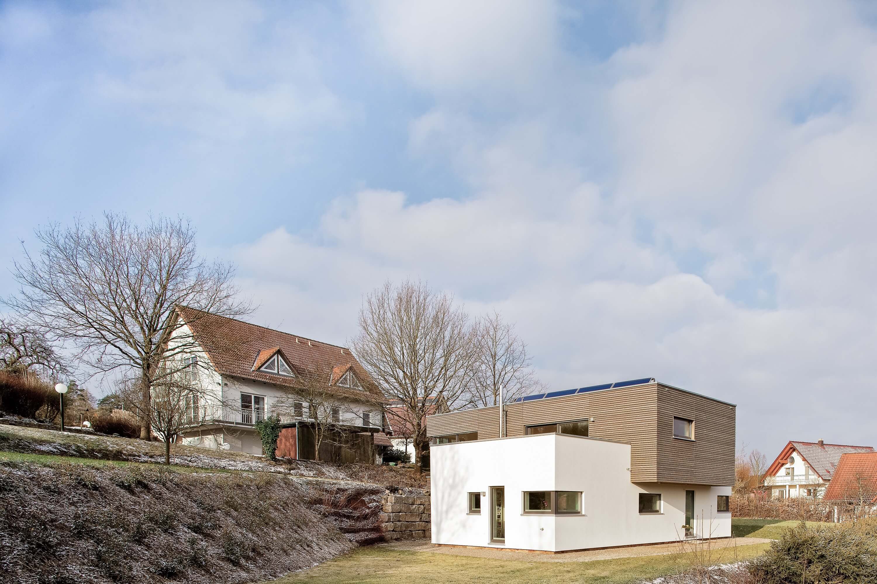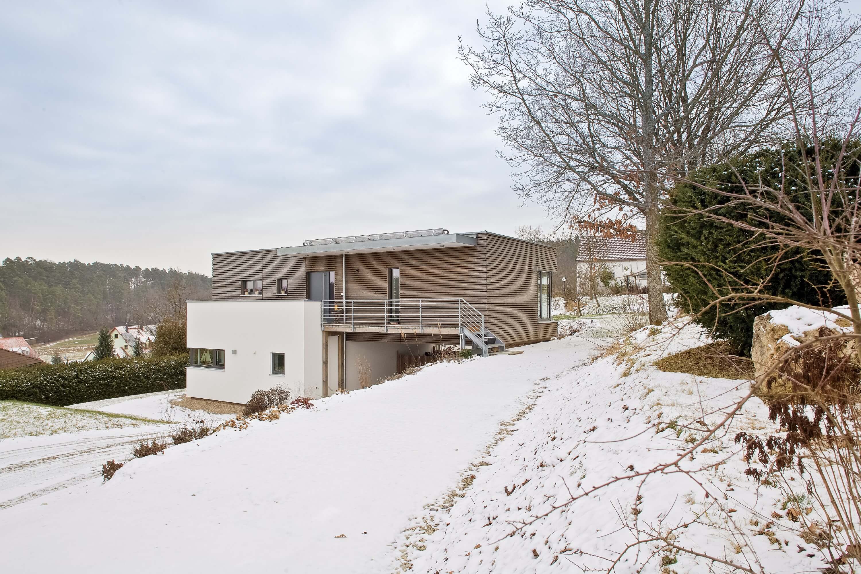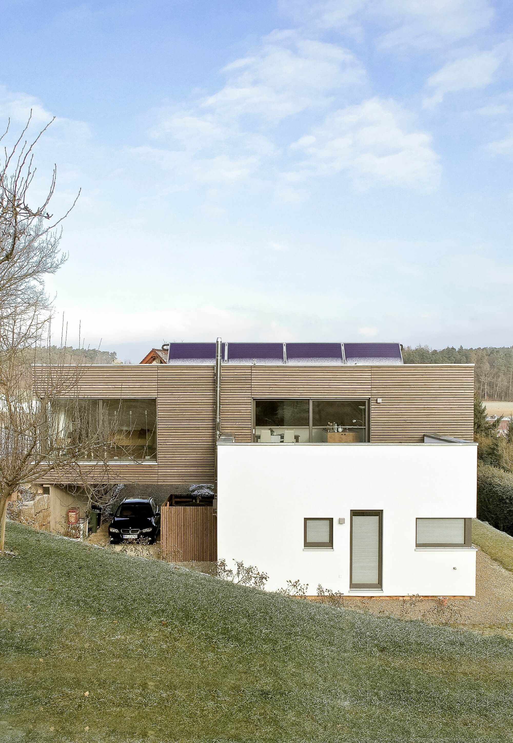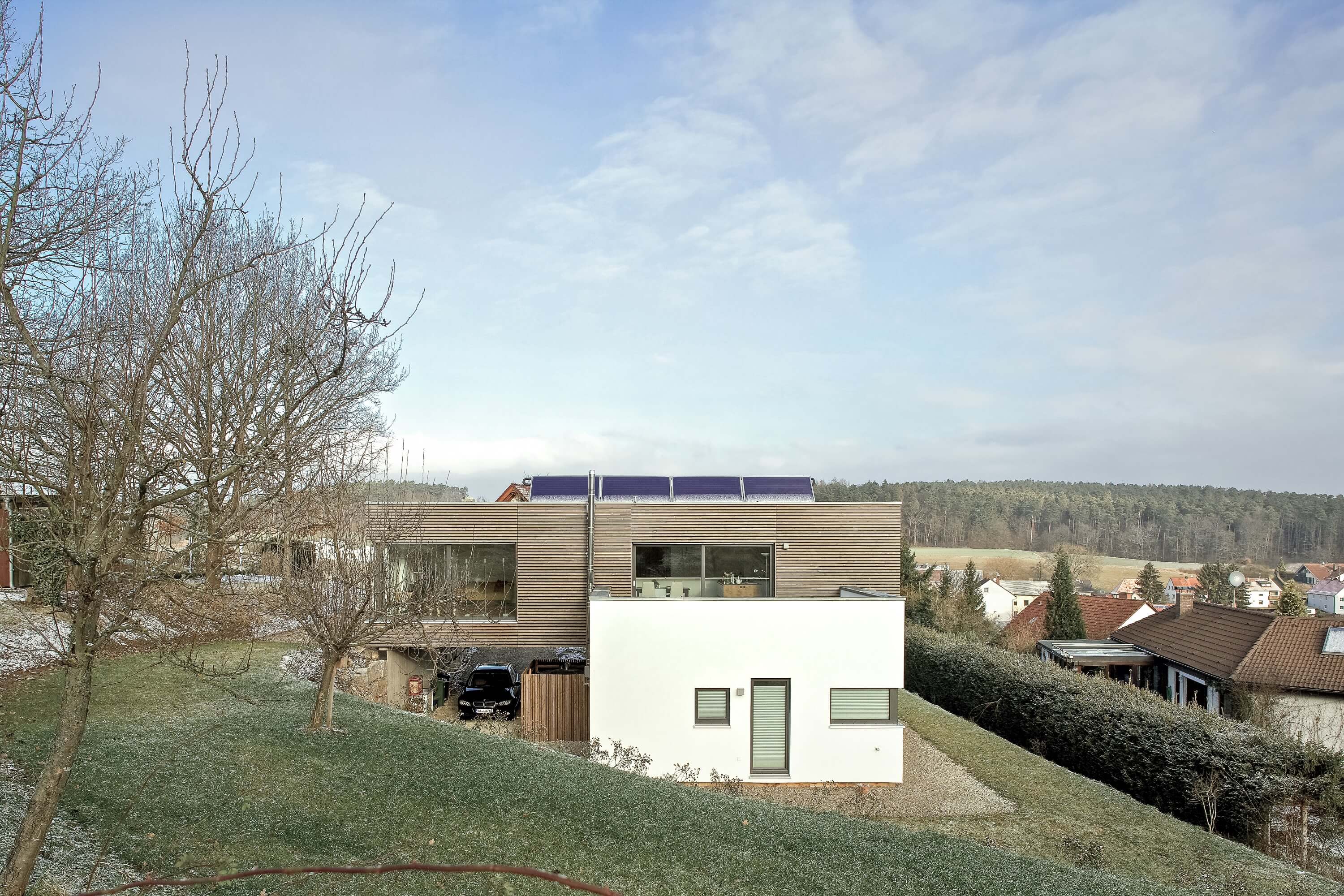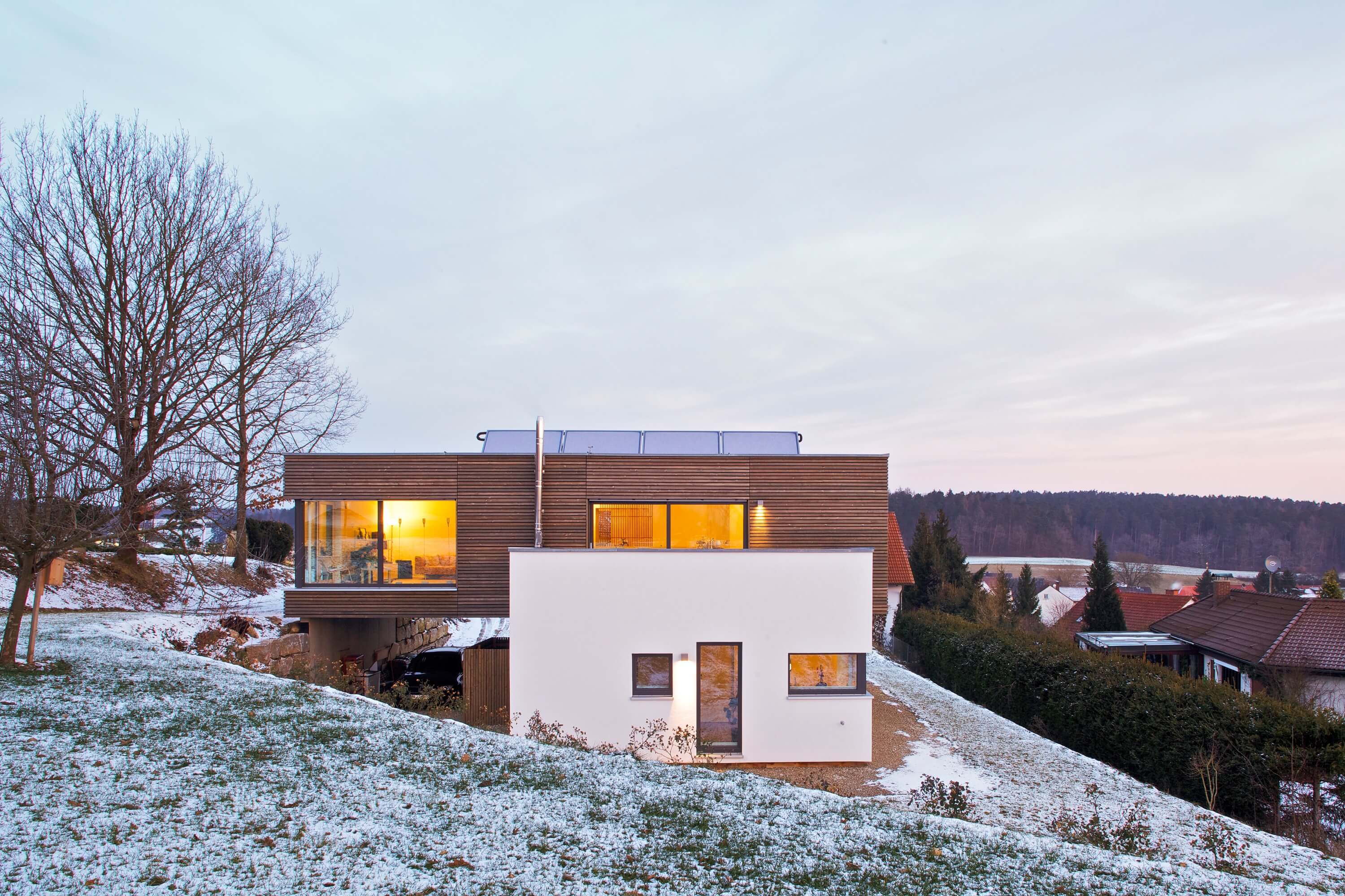 Dieser Baukörper zeugt von wohldurchdachter Passivhaus-Architektur: Orientiert an der Topographie des Ortes bietet das Wohnhaus spannende Aus- und Umblicke und wird dabei sämtlichen Gestaltungsanforderungen des Bauherrn gerecht. Schon die Realisierung in der Holzbauweise besticht durch eine hervorragende Ökobilanz. Jedoch zeigt vor allem der knapp über dem Passivhaus-Wert liegende Energiestandard, in Kombination mit der Solarthermie, dem neuartigen, wandhängenden Pelletkessel mit 7 kW sowie der Lüftungsanlage mit Erdwärmetauscher, wie sich zukunftssicheres Bauen bereits heute gelungen umsetzen lässt.