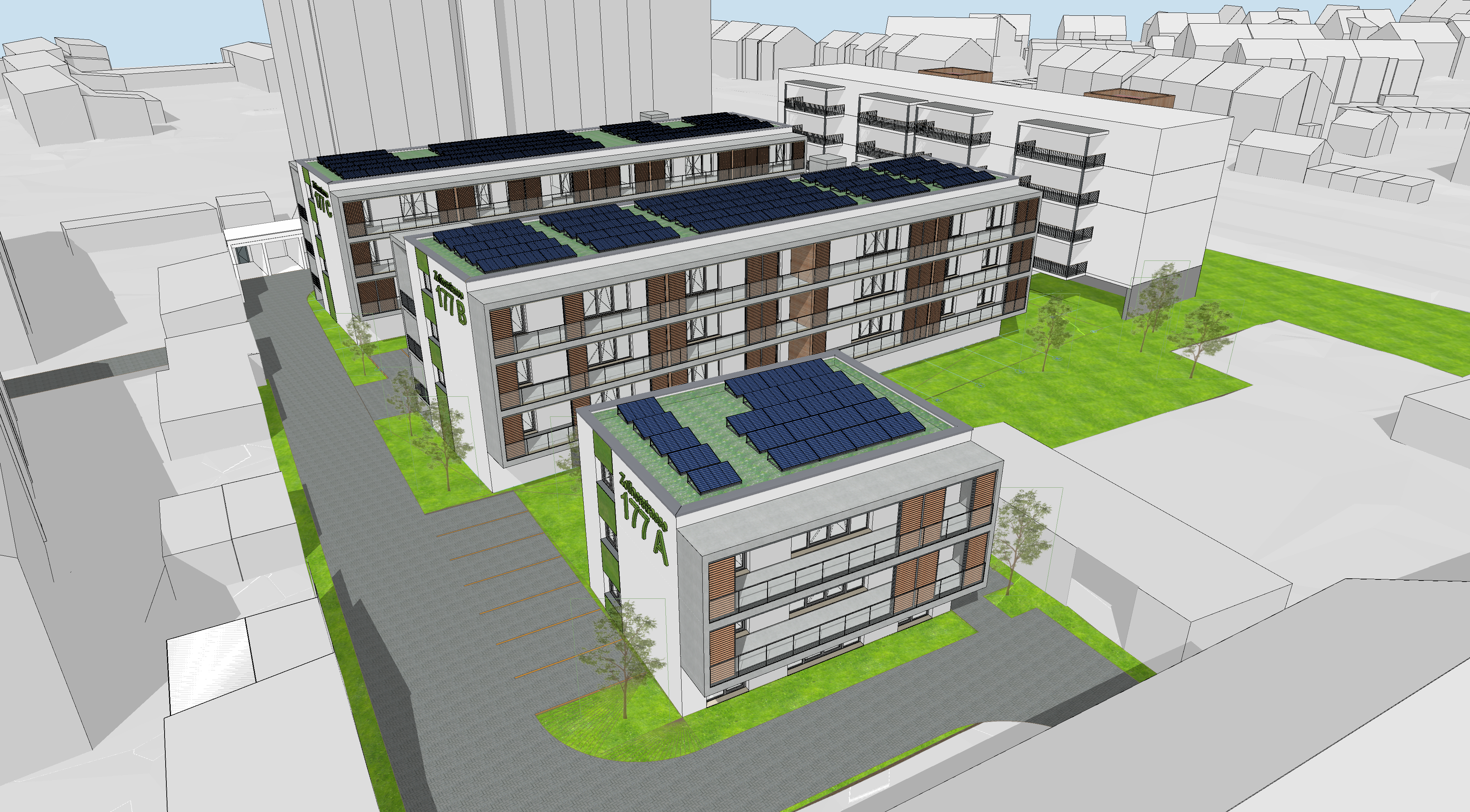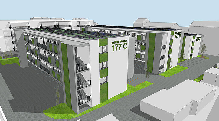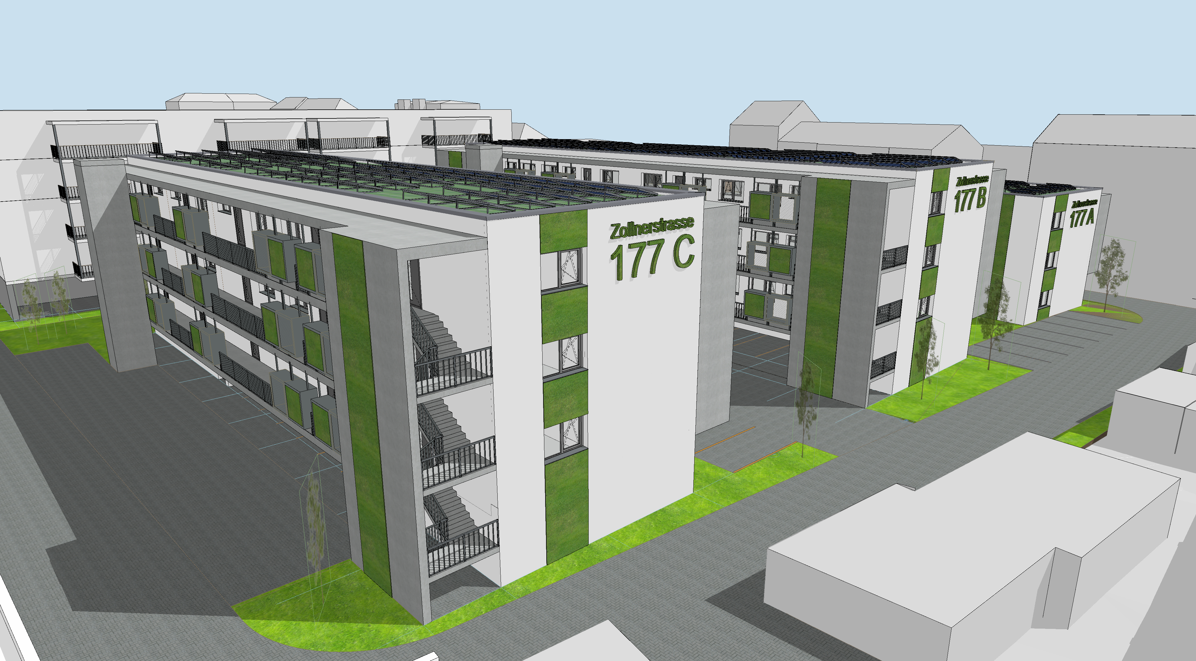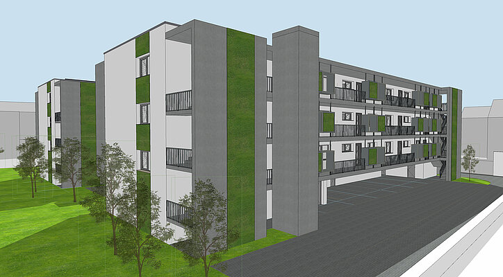 Die Gebäudekomplexe bestehen aus vorgefertigten Raummodulen mit einem Vorfertigungsgrad von 90 %. Alle Anbauteile wie Balkone, Laubengänge, Treppen und Aufzugschächte werden als Oberflächenfertige Bauteile (ready to use) montiert.