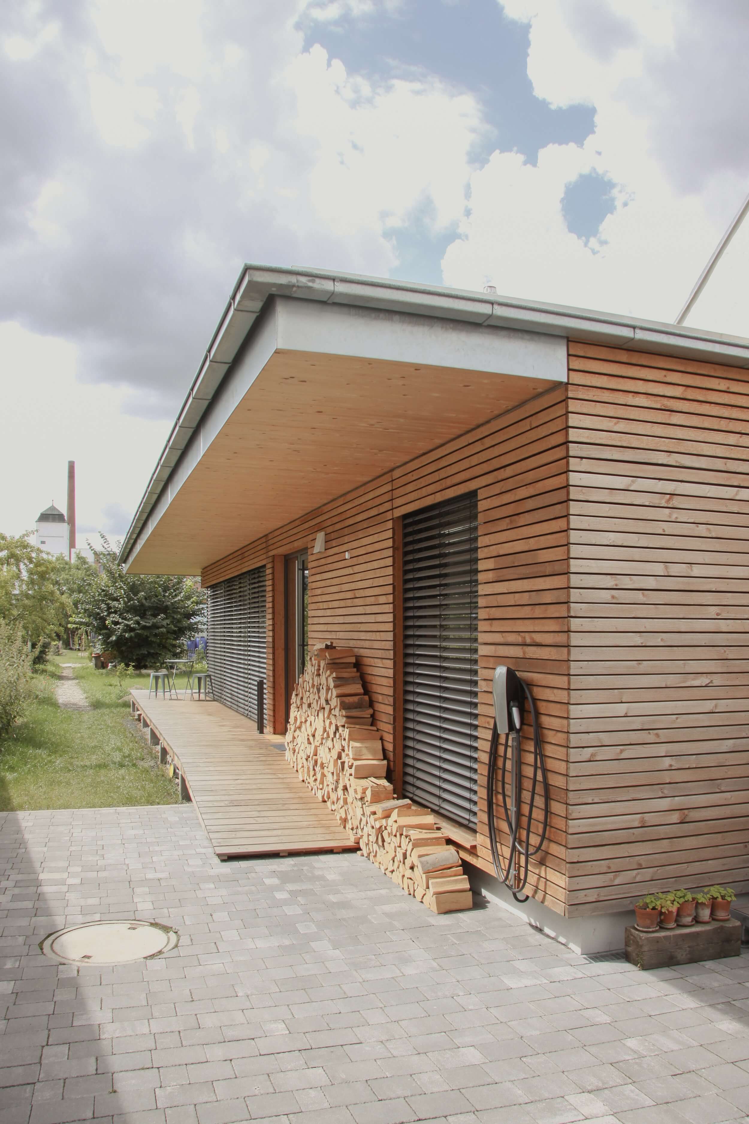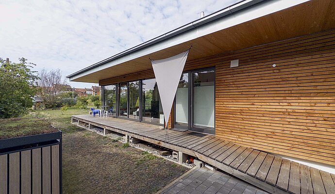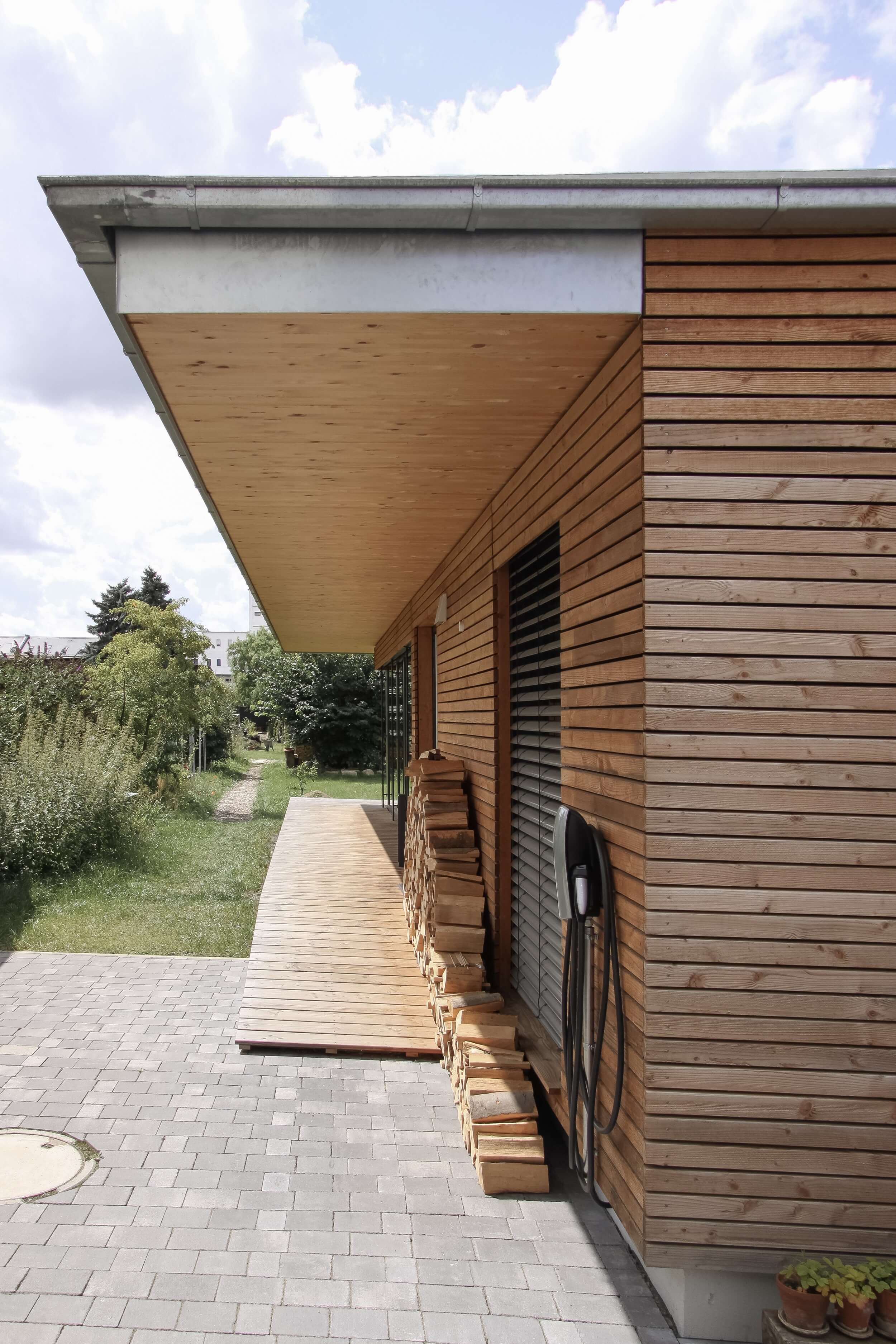 Das Gebäude im Hinterhof des historischen Bamberger Gärtnerviertels bietet für seine Nutzer sowohl die Vorteile der zentralen Lage inmitten der Stadt, aber auch Privatsphäre durch die Orientierung des Gebäudes hin zu den ehemaligen Anbauflächen im Hinterhof. Der Bauort hinter der Blockrandbebauung war eine Herausforderung hinsichtlich der Baustellenlogistik. Die gewählte modulare Holzbauweise war deshalb hervorragend geeignet, sodass mithilfe eines Krans alle Bauteile über die Bestandsbebauung gehoben werden konnten. Der eingeschossige Holzrahmenbau mit Brettschichtholzdecke und Flachdach ist in seiner Grundfläche auf die wesentlichen Anforderungen der Nutzer reduziert. Die privaten Räume sind im hinteren Gebäudeteil angeordnet. Der Meeting-Bereich öffnet sich nach vorne hin zur Terrasse, die ebenfalls von dem großen auskragenden Flachdach überdeckt wird. Durch die große Glasfassade kann der Außenbereich dem Besprechungsraum zugeschaltet werden, sodass ein spannender Übergang zwischen Innen und Außen entsteht.