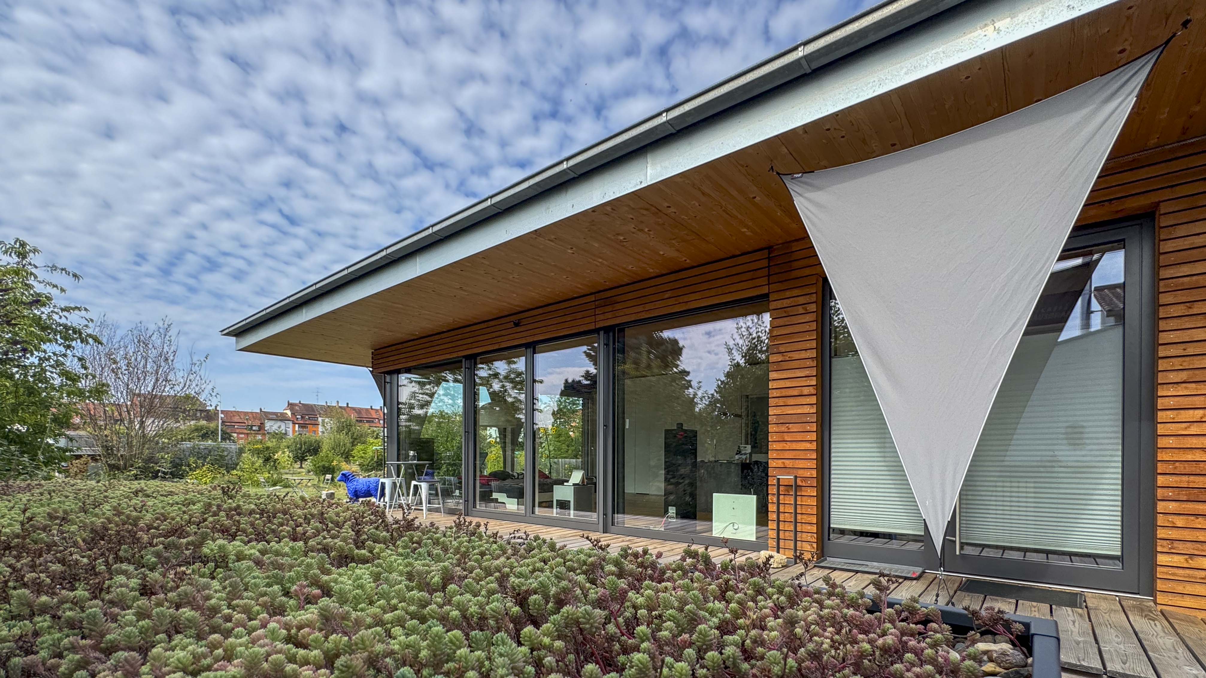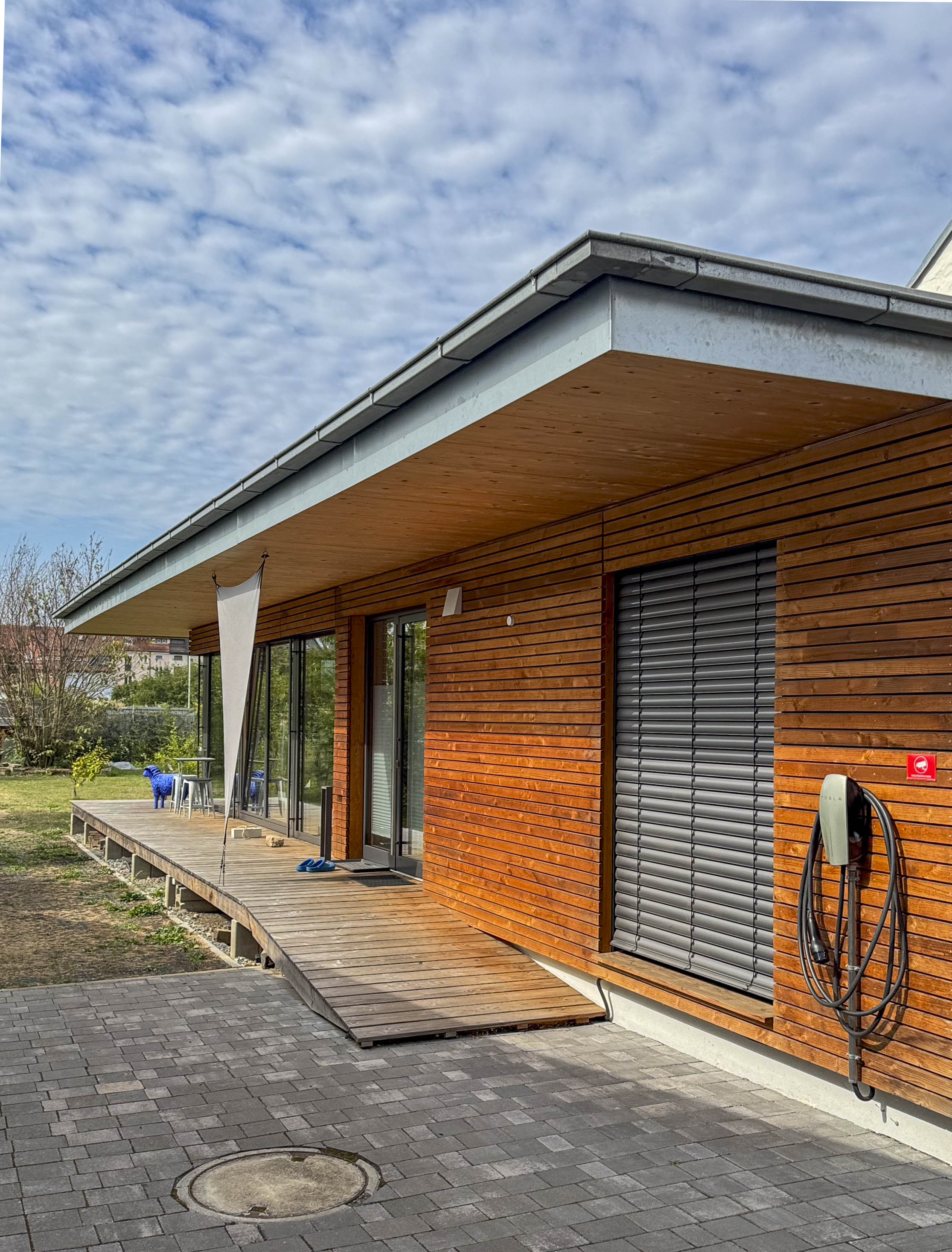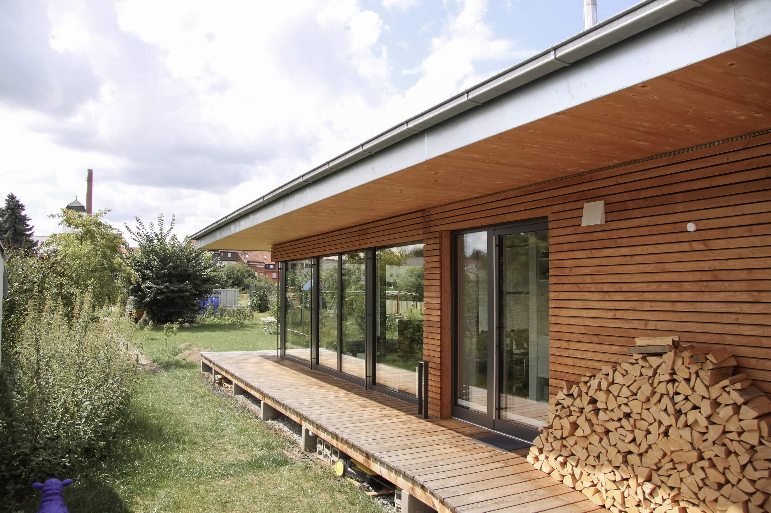 Das Gebäude im Hinterhof des historischen Bamberger Gärtnerviertels bietet für seine Nutzer sowohl die Vorteile der zentralen Lage inmitten der Stadt, aber auch Privatsphäre durch die Orientierung des Gebäudes hin zu den ehemaligen Anbauflächen im Hinterhof. Der Bauort hinter der Blockrandbebauung war eine Herausforderung hinsichtlich der Baustellenlogistik. Die gewählte modulare Holzbauweise war deshalb hervorragend geeignet, sodass mithilfe eines Krans alle Bauteile über die Bestandsbebauung gehoben werden konnten. Der eingeschossige Holzrahmenbau mit Brettschichtholzdecke und Flachdach ist in seiner Grundfläche auf die wesentlichen Anforderungen der Nutzer reduziert. Die privaten Räume sind im hinteren Gebäudeteil angeordnet. Der Meeting-Bereich öffnet sich nach vorne hin zur Terrasse, die ebenfalls von dem großen auskragenden Flachdach überdeckt wird. Durch die große Glasfassade kann der Außenbereich dem Besprechungsraum zugeschaltet werden, sodass ein spannender Übergang zwischen Innen und Außen entsteht.
